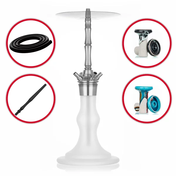 Die Metallteile der Shisha bestehen aus hochwertigem 1,4305 V2A Edelstahl aus der Schweiz und das Glas selbst ist mundgeblasen. Eine qualitativ hochwertige Verarbeitung von oben bis unten.